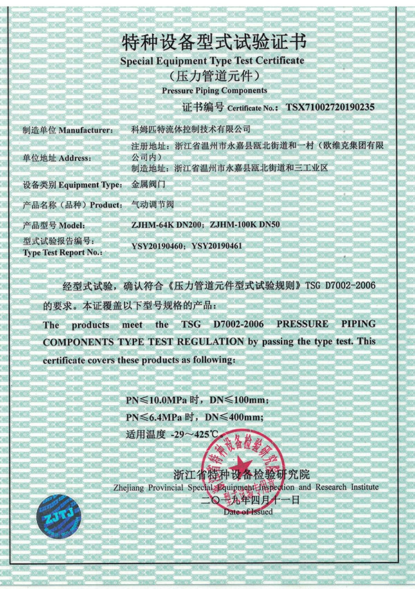 特种装备型式试验证书(气动调...